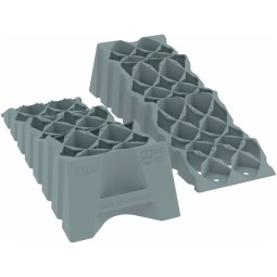 Fiamma hoogwaardig trapwigsysteem met drie treden op 7, 13 en 17 cm hoogte. De opstapwiggen kunnen eenvoudig worden vervoerd dankzij de handgreep aan de achterkant.