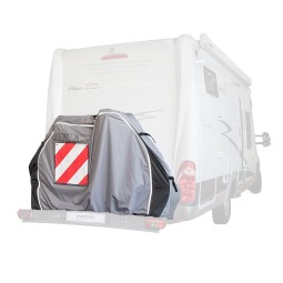 Beschermt uw fietsen tijdens het transport op een fietsendrager bevestigd aan de achterwand van kampeervoertuigen Hoes voor waarschuwingsbord (50x50 cm) Makkelijke montage en perfecte aansluiting dankzij de elastische koorden en stalen haken Materiaal: extra sterk Ripstop polyester 210D met PU...